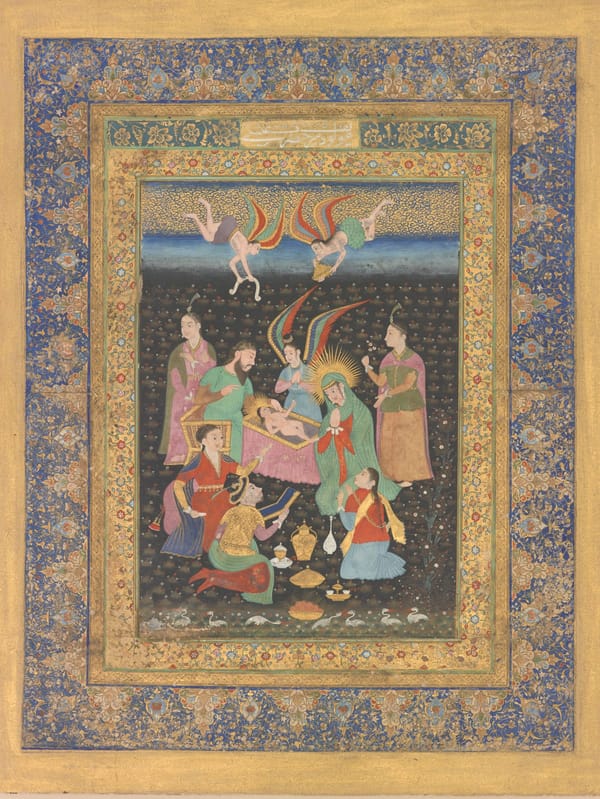 The painting is believed to have been commissioned by a member of the Medici family in Florence[2], and was inherited by Lorenzo de' Medici in 1492[2]. It features a star that guided the Three Kings, suggested by a man's amazed upward gaze[4], and the many seeds of the pomegranate held by the infant refer to the Church’s sheltering of believers[4]. The painting also includes a large procession of retinues arriving through an arch that is part of a large ruined structure[3].