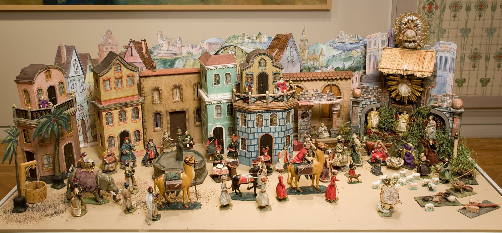 German Nativity Scene (Krippe): – Elaborate 81-piece nativity featuring various figures, animals, and Baroque architecture. Unknown Artist: 18th-century German artisan, likely a carver specialized in religious folk art and complex multi-figure displays.