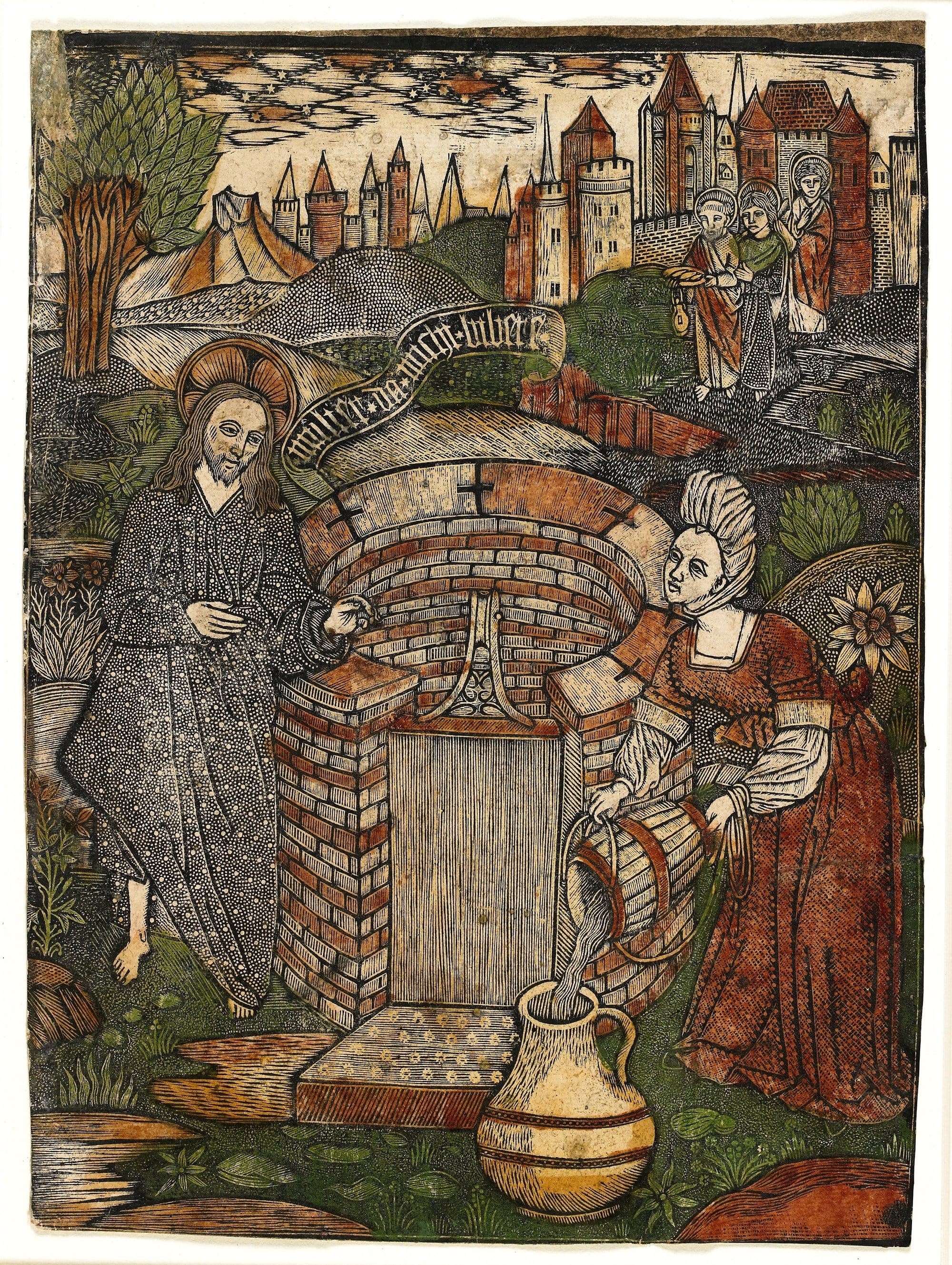 Christ asks the Samaritan woman to give him water to drink. She is taken aback because Jews did not associate with Samaritans. He speaks to her of the water of life that cures all thirst and reveals himself as the Messiah. The maker of this metalcut used punches, gouges, and engraving tools to produce a rich array of textures that give the surface an animated character. The textures enabled the image to compete with completely hand-painted imagery despite being colored with a very limited palette. Prints of this scale and sophistication were sometimes pasted into books as supplementary illustrations, which is why they have survived for more than 500 years.
