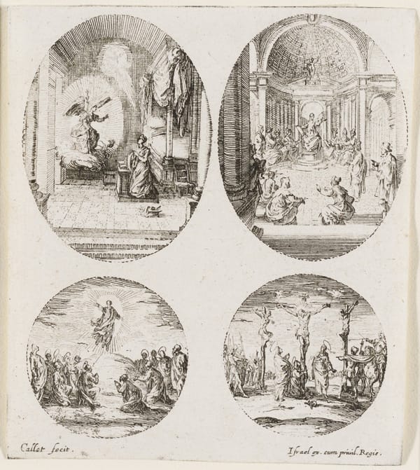 This small, gold-ground panel—most likely a fragment of a larger altarpiece—layers several episodes from Christ's Crucifixion at Golgotha (in Hebrew, "the place of the skull"). These are rendered in poignant detail and include the soldier piercing Christ's side with a lance, the group of antagonists gambling to claim his garments, Saint John the Evangelist comforting the Virgin Mary as she collapses in grief, and the Roman centurion Longinus (at center, in red) recognizing Christ's divinity. The frowning sun on Longinus's shield refers to the solar eclipse at the hour of Christ's death. source