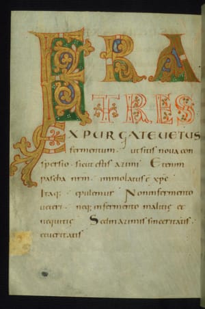 This Lectionary was created ca. 1000 in Trier. Written in a clear Caroline minuscule, it contains decorated initials at the openings of important readings. A set of illuminated letters marks the beginning of the Epistle and Gospel lessons for Easter; they display the hierarchy of scripts with capital letters decorated with gold leaf or drawn in red ink, followed by uncial and Caroline minuscule. Initials in orange, sometimes filled with gold, mark the divisions of the text. The book has been stylistically compared with Ottonian manuscripts, especially with a Psalter preserved in Trier (Stadtbibliothek, Ms. 7) illuminated by the so-called Master of the Registrum Gregorii.