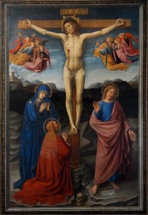 Donato de’ Bardi’s style brings together Netherlandish and French influences, focusing on refined detail and careful study of light. At the center of this painting, which is still in its original frame, Donato captures the sheltering affection between the infant Christ and Madonna. Gesturing to the goldfinch in his hand, a symbol of the resurrection, the child reassures his mother that his destiny is ultimately one of hope. These panels may have been commissioned by Duke Filippo Maria Visconti (1392–1447) and his mistress Agnes del Maino, as their names match those of the two saints appearing on the wings of the triptych.