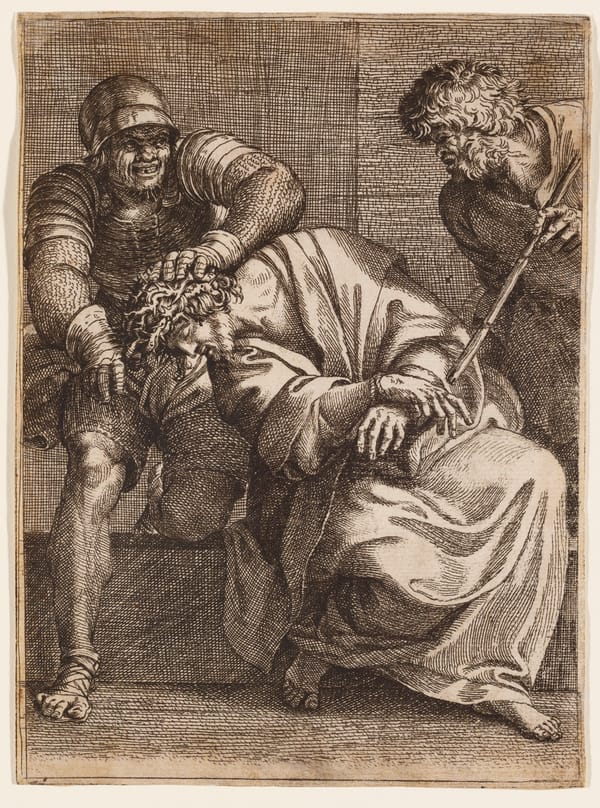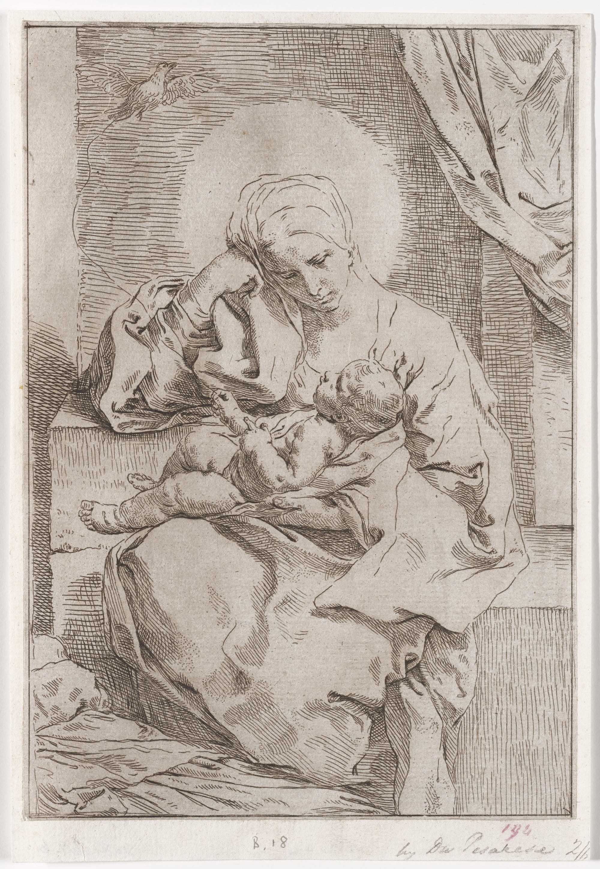 The Virgin Mary sits on a stone bench. A halo of light around her head cuts through the shadows of the space. She looks tired and pensive as she cradles the baby Jesus in her lap. Any new parents can recognize the exhaustion and the weight of responsibility. She rests her head against her closed right hand, a traditional sign of melancholy. Jesus looks up at a bird flying in the upper left corner of the image. The bird is tethered by a string, which Jesus holds in his right hand. The bird may symbolize the soul, which is only tenuiously held by the body. Mary's prefigures the sadness she will fell after the Crucifixion. source: artsmia.org