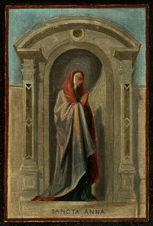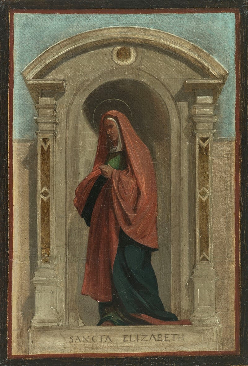 Sainte Elisabeth: Saint Elizabeth, mother of John the Baptist and kinswoman of Mary (Gospel of Luke 1). Nicolas Auguste Hesse: 19th‑century French painter known for religious, historical, and allegorical works and stained‑glass designs.