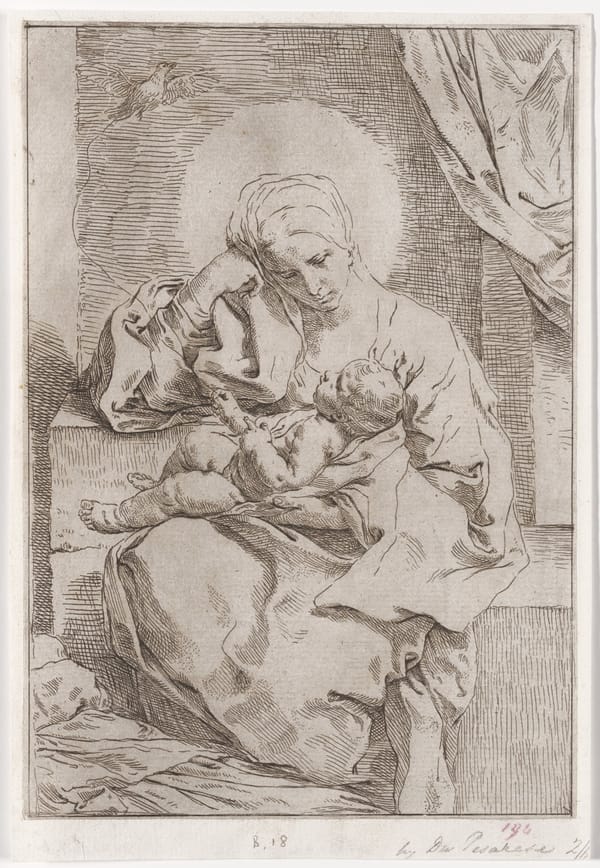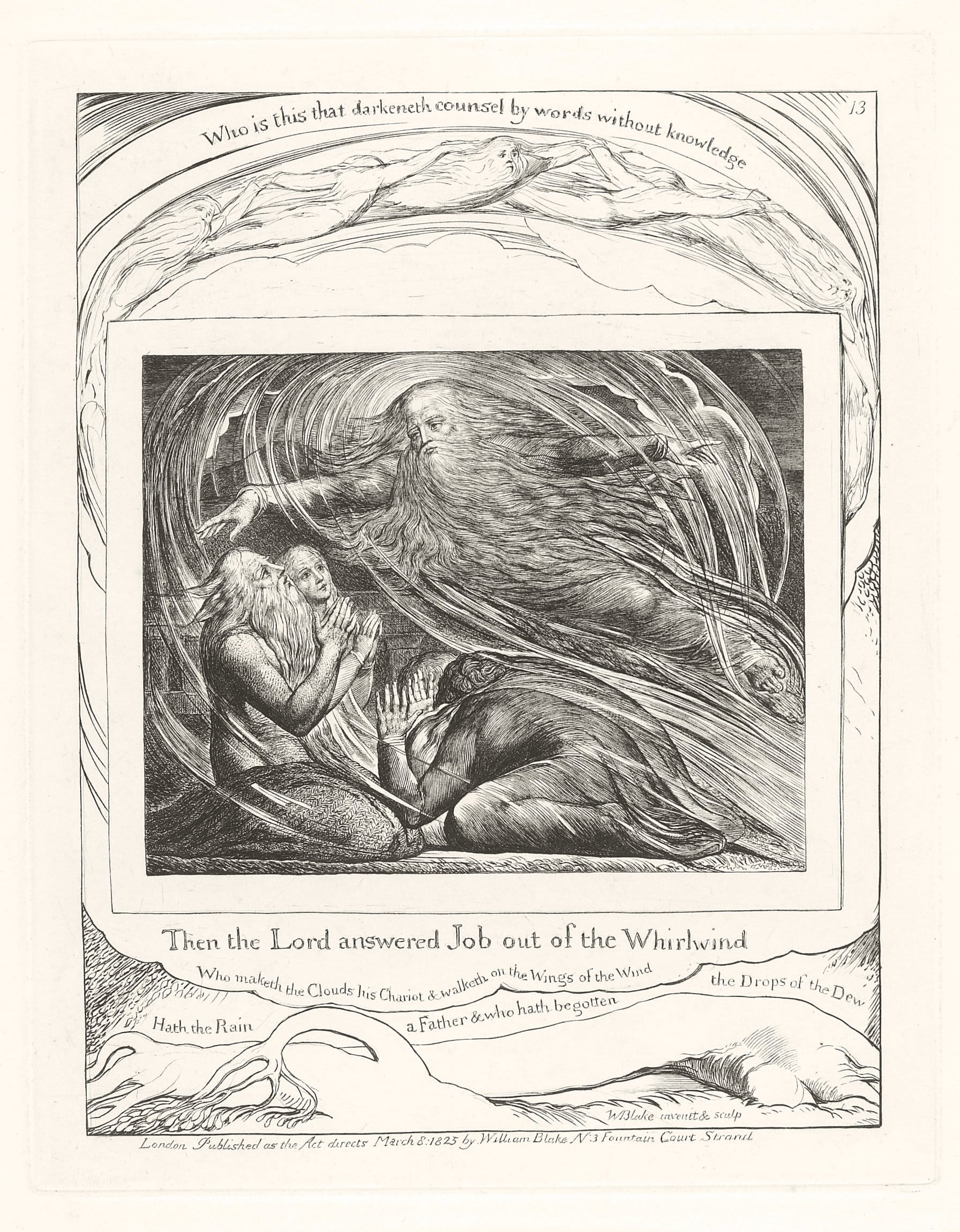 Finally, in the Whirlwind of the mystical ecstasy, the true God is manifest. He is Jesus, the Divine Imagination, and the Forgiveness of Sins: the only God whom Blake recognized. He is in a cruciform position and his right foot is forward. He descends below the cloud-barriers which normally separate the worlds. Job and his wife behold God with serene joy. To the right, Job's friends cannot see God because the blast blows them flat like the Forest of Error in the margin below. Job's pride is crushed at last; his life is made straight; his faith is confirmed. In the upper margin continues the circular motion of the Whirlwind. The figures are the six Eyes in their rotation; inevitably they have reached the seventh, who is Jesus, whose likeness is that of Job. source: artsmia.org