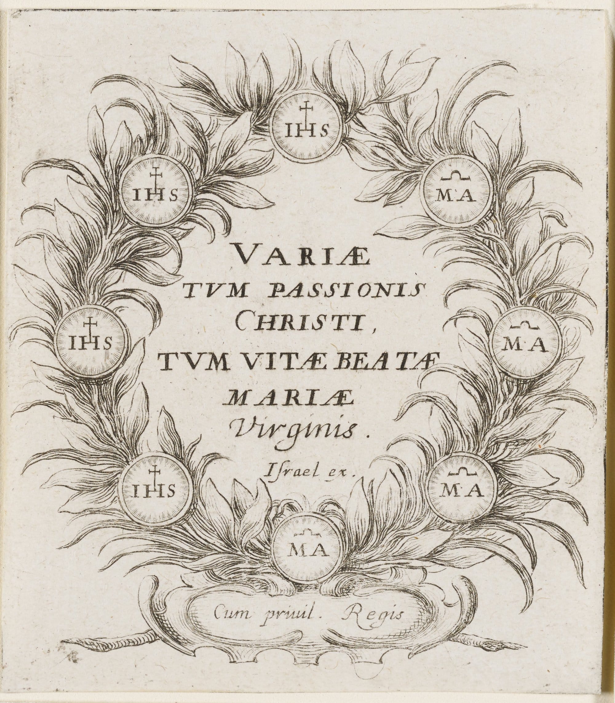An ornamental title page featuring religious monograms and foliage for a series on Christ and Mary. Abraham Bosse: 17th-century French artist and master etcher known for detailed depictions of daily life and religious subjects.