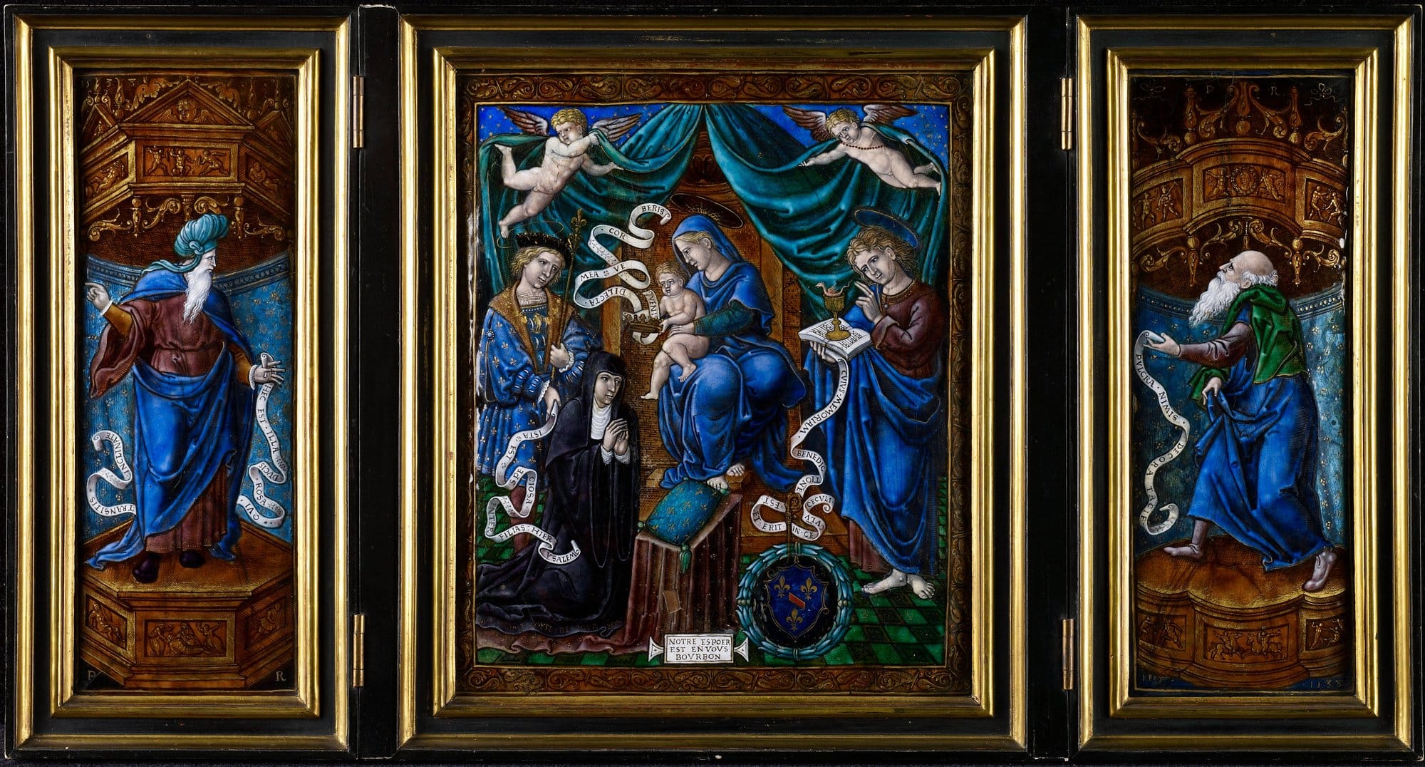 This scene depicting the Virgin Mary, her infant son Jesus Christ, and various saints and prophets also includes the kneeling figure of Louise de Bourbon (1495–1545), a member of the French royal family (Note the inscription LOYSE DE BOURBON on the hem of her dark habit). She was the abbess of Fontevrault, an important religious foundation with a long history of royal patronage. Enameled objects like this one were highly prized for the great artistry and technical skill required to make them. Enameling involves painting a metal surface with powdered glass, which is then fused to the metal by heating. Inserting gold or silver foil between layers of enamel, as was done here, makes the colors more luminous. The town of Limoges, in southwestern France, where this triptych was made, has been an important center of enamel production since the 12th century. source: artsmia.org
