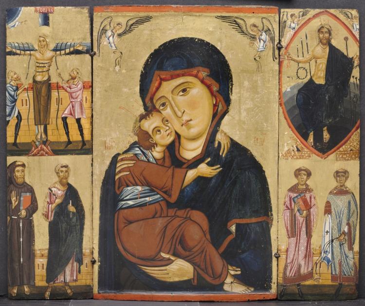 This small altarpiece, intended for a domestic interior or private chapel, consists of three panels, allowing it to be folded and easily transported. Surrounding the Virgin and Child in the center are various saints. On the left is Saint Andrew crucified, with St. Francis and St. Paul below; on the right, is Christ with the instruments of the Passion, and St. Stephen and St. Lawrence below. The long expressive lines that define the clothing and hands of the figures are typical of Byzantine painting, which spread from Constantinople to Italy in the Middle Ages. Berlinghiero is one of the earliest Italian painters known by name. He lived in Lucca, the most important artistic center in Tuscany before the rise of Siena and Florence. Berlinghiero headed a large, influential workshop that included his sons. This tabernacle was recognized by Berlinghiero while in the collection of Adolphe Stoclet, a wealthy Belgian engineer and collector.